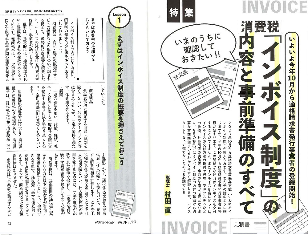 今月の特集ではインボイス制度の内容の確認から必要な事前準備までをわかりやすく解説します。いざスタートとなって慌てないためにも必読です!!