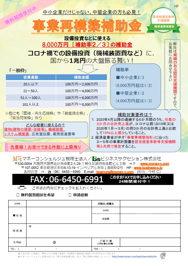 新型コロナの影響が長期化し、当面の需要や売上の回復が期待し難い中、ウィズコロナ・ポストコロナの時代の経済社会の変化に対応するために、思い切った事業再構築に意欲を有する中小企業等の挑戦を支援することで、日本経済の構造転換を促すことを目的とて、1月16日より公募がスタートしました。