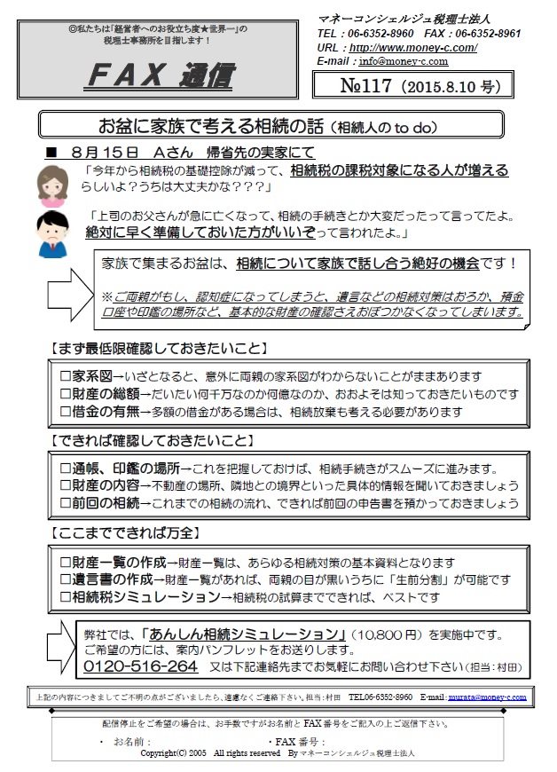 中小企業の経営者及び総務経理担当者・相続関係者向けに、「知って得する」「知らないと損する」税務情報を、メルマガ、FAX、冊子の3種類の媒体でお届け。