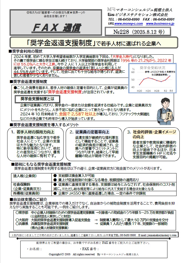 中小企業の経営者及び総務経理担当者・相続関係者向けに、「知って得する」「知らないと損する」税務情報を、メルマガ、FAX、冊子の3種類の媒体でお届け。