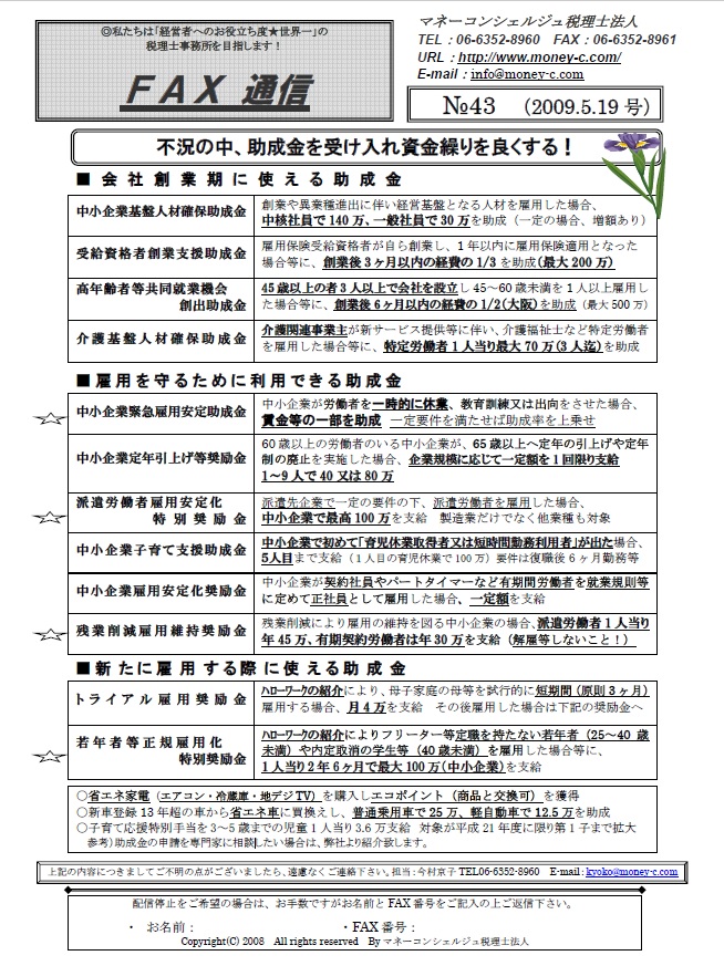 中小企業の経営者及び総務経理担当者・相続関係者向けに、「知って得する」「知らないと損する」税務情報を、メルマガ、FAX、冊子の3種類の媒体でお届け。