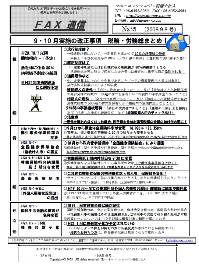 中小企業の経営者及び総務経理担当者・相続関係者向けに、「知って得する」「知らないと損する」税務情報を、メルマガ、FAX、冊子の3種類の媒体でお届け。