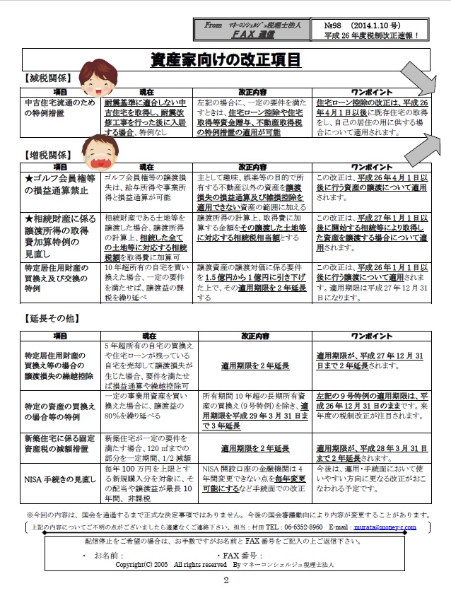 中小企業の経営者及び総務経理担当者・相続関係者向けに、「知って得する」「知らないと損する」税務情報を、メルマガ、FAX、冊子の3種類の媒体でお届け。