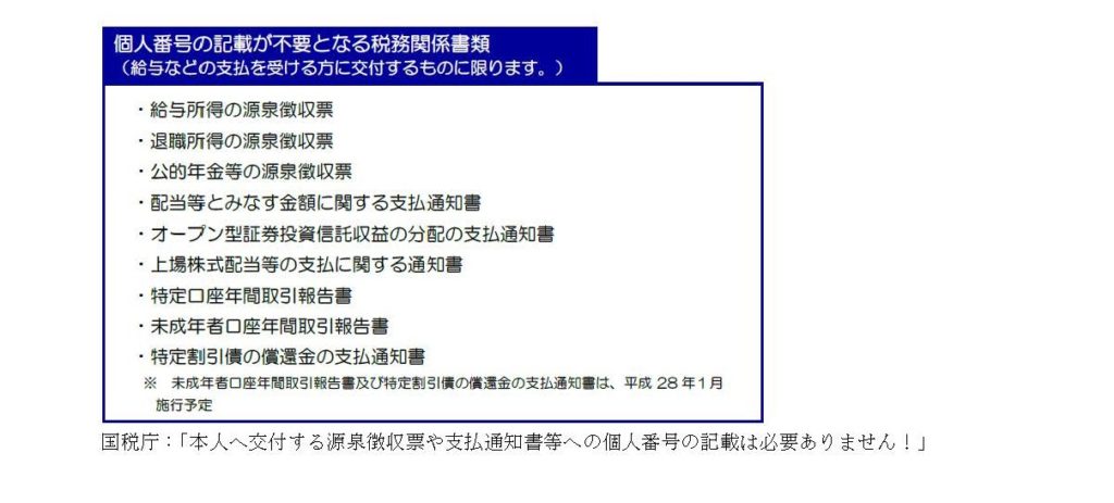 平成27年10月2日に所得税法施行規則等の改正が行われました。それまでは、支払を受ける方に対して交付する源泉徴収票などについて、本人等の個人番号を記載して交付しなければならない、とされていましたが、行政手続における特定の個人を識別するための番号の利用等に関する法律施行後の平成28年1月以降も、給与などの支払を受ける方に交付する源泉徴収票などへの個人番号の記載は行わないこととされました。