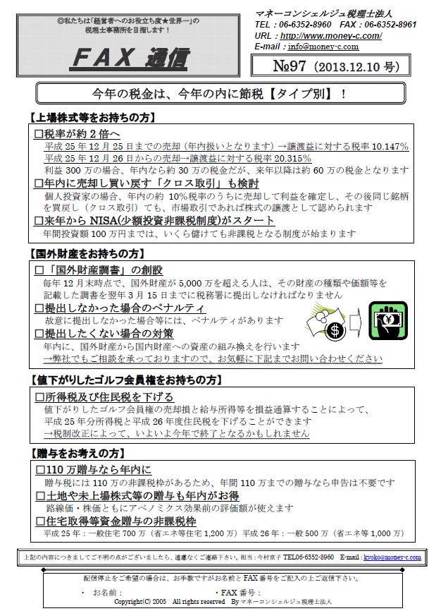 中小企業の経営者及び総務経理担当者・相続関係者向けに、「知って得する」「知らないと損する」税務情報を、メルマガ、FAX、冊子の3種類の媒体でお届け。