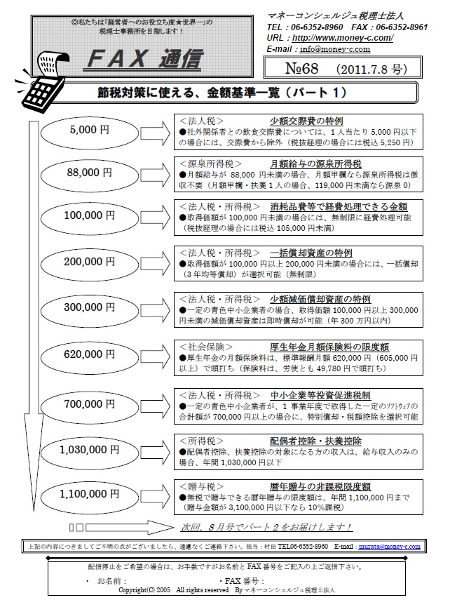 | ・5,000円 ・88,000円 ・100,000円 ・200,000円 ・300,000円 ・620,000円 ・700,000円 ・1,030,000円 ・1,100,000円 | <法人税> <源泉所得税> <法人税・所得税> <法人税・所得税> <法人税・所得税> <社会保険> <法人税・所得税> <所得税> <贈与税> | 少額交際費の特例 月額給与の源泉所得税 消耗品費等で経費処理できる金額 一括償却資産の特例 少額減価償却資産の特例 厚生年金月額保険料の限度額 中小企業等投資促進税制 配偶者控除・扶養控除 暦年贈与の非課税限度額 |