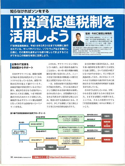 2005/7/4 アスキービジネス創刊号にて監修しました。 「IT投資促進税制を活用しよう」 - 株式会社アスキー刊 アスキービジネスITスキルアップ8月創刊号 -