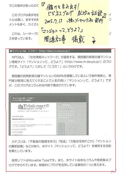 2005/7/20 ブログが本で紹介されました。 「マンションは、こうだ!」 - ソーテック社刊 「儲けを生み出す!ビジネスブログ成功の秘訣」 -