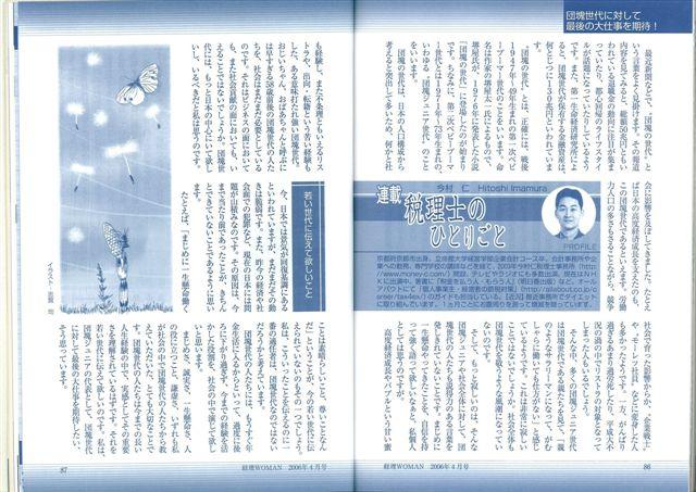 2006/3/29 「税理士のひとりごと」 「団塊世代に対して、最後の大仕事を期待!」 - 株式会社研修出版刊 月刊経理ウーマン2006.4月号 -