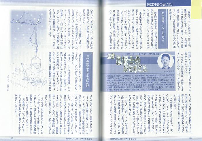 「確定申告の思い出」 税理士のひとりごと 前々回の確定申告(平成17年分確定申告)時期である平成18年3月10日頃、生まれて初めてインフルエンザにかかりました。東京出張を終えて帰ってから調子が悪くなったので、感染はそのときかと思うのですが、最初はインフルエンザに自分がかかっているとは気づきませんでした。とても重い風邪にかかったぐらいに受け止めていました。また、受け止めざるを得ない状況でした。というのは、確定申告終盤で飛び込みの仕事が入ってきていましたし、確定申告の最終確認・発送作業などに追われている状況でもありましたから。