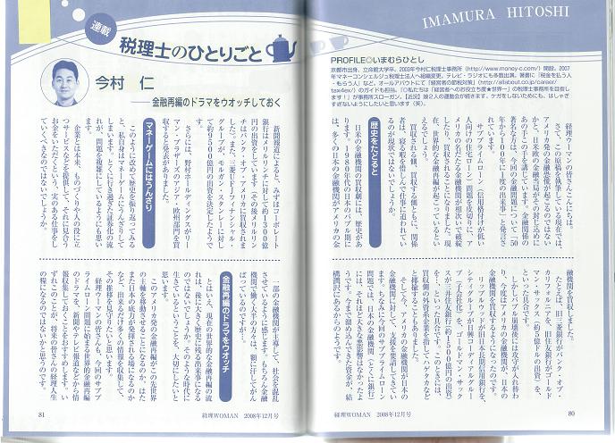 「金融再編のドラマをウオッチしておく」 税理士のひとりごと とはいえ、現在の世界的な金融再編の流れは、後に大きく歴史に残るような出来事になると思います。その時代に生きているということを、大切にしたいと思います。このアメリカ発の金融再編がこの先世界の主軸を移動させることになるのか、はたまた日本の底力が発揮される場になるのかなど、出来るだけ多くの情報を収集してその推移を見守りたいと思います。