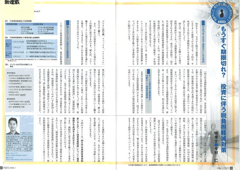 2005/12/30 月刊「PRITI」にて連載開始 「税金のこと、知らずに損していませんか?」 - 社団法人生命保険ファイナンシャルアドバイザー協会刊 PRITI(プリーティ) 平成18年1月号より連載開始 -