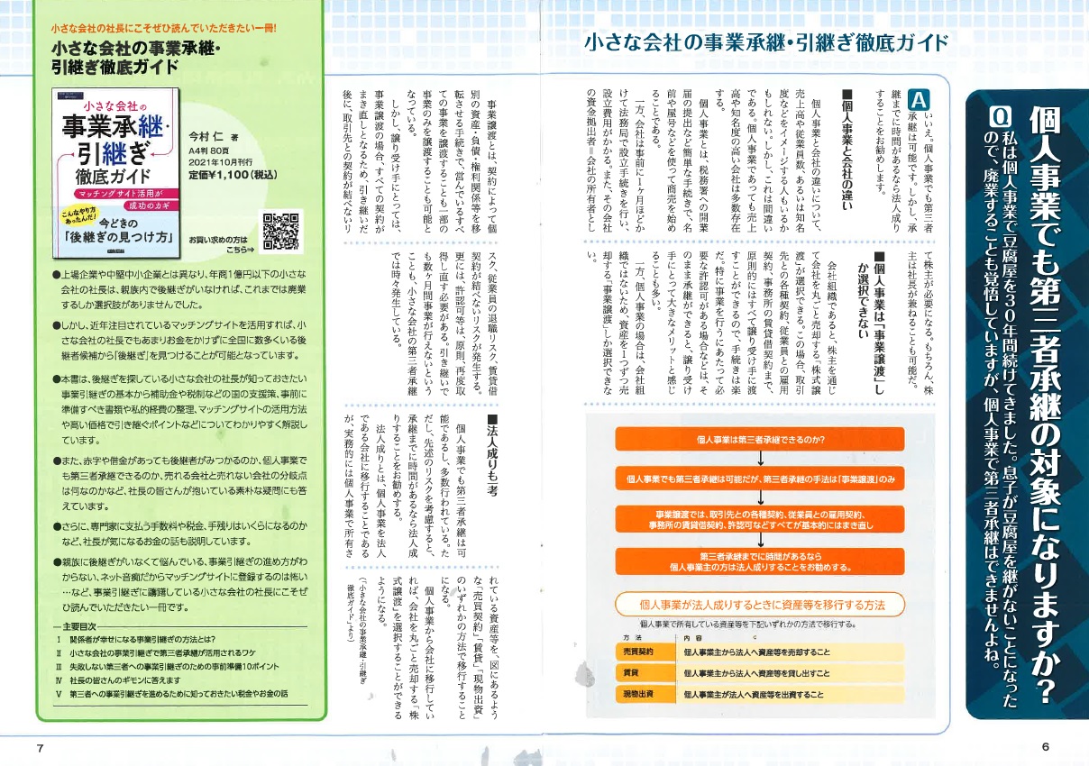 『私は個人事業で豆腐屋を30年間続けてきました。息子が豆腐屋を継がないことになったので、廃業することも覚悟していますが、個人事業で第三者承継はできませんよね。』